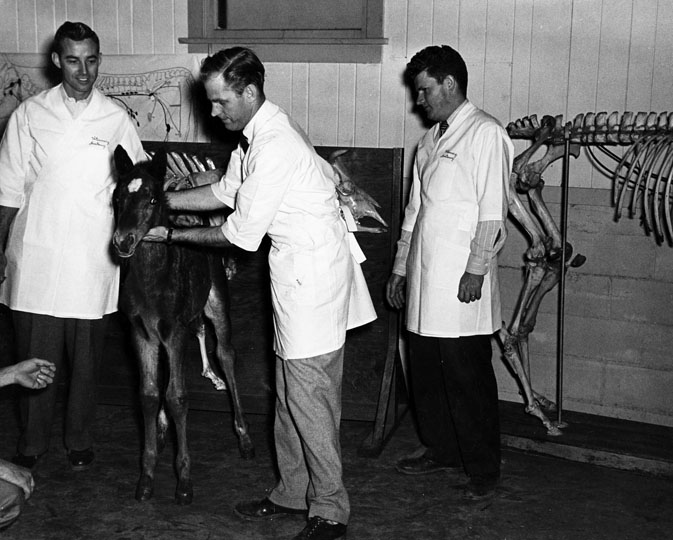 The School of Veterinary Medicine, the 17th in the United States, opened its doors on Monday, March 1, 1948, with Dean Clarence McElroy on hand to welcome 31 students. McElroy (affectionately known as “Dean Mac”) had been involved in a much earlier attempt to start a veterinary school at Oklahoma A&M College as an assistant to Dr. L.L. Lewis. That experience had been McElroy's personal motivation to become a veterinarian himself. Dr. Duane Peterson taught the first class at the new school. The first new building for the school was constructed in 1949.
